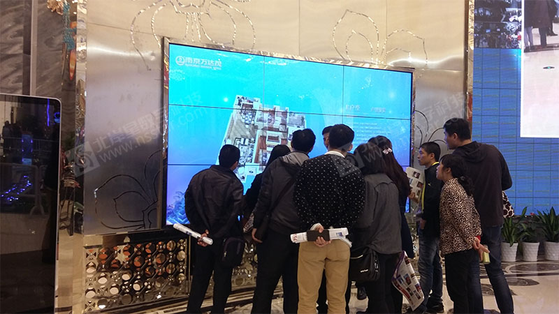 參觀者正在操作拼接屏上的電子樓書,電子樓書包含3D項目漫游,360戶型鳥瞰,720度樣板間漫游等。