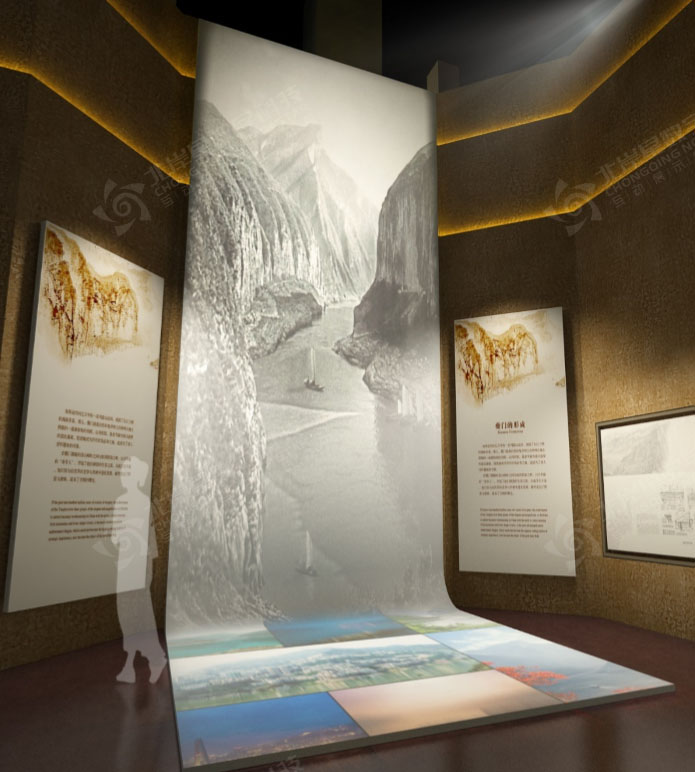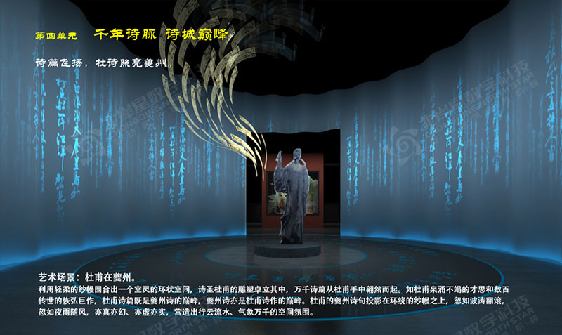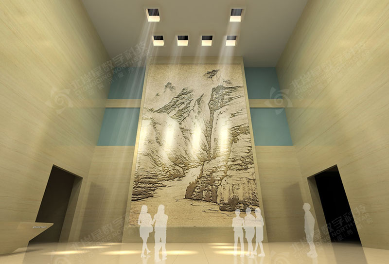 項目包含9米高的L折幕、全息紗幕投影、3D動畫制作、航拍視頻、互動書法簽名系統(tǒng)、AR互動拍照系統(tǒng)、觸摸屏軟件查詢系統(tǒng)、詩詞查詢系統(tǒng)、文化遺址電子沙盤、ipad無線全館設(shè)備及燈光中控系統(tǒng)、水墨動畫等……