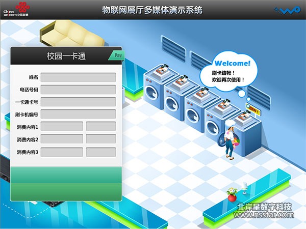 “校園一卡通”自動點餐、打水、洗衣、買電等功能沙盤聯(lián)動控制:用聯(lián)通手機(jī)在沙盤上的“校園食堂”處“晃一晃”,大屏幕上會自動顯示點餐演示系統(tǒng)。