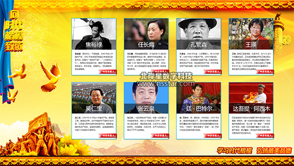 《時代楷模》:70寸多點(diǎn)液晶觸摸屏。內(nèi)含一套操作方便、設(shè)計(jì)精美,內(nèi)容豐富的多媒體互動軟件。操作員可以無限添加修改或上傳軟件中的內(nèi)容。