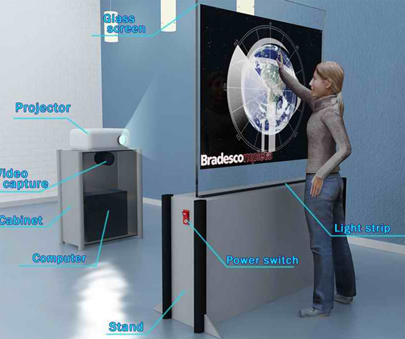 全息櫥窗又叫電子櫥窗、數(shù)字櫥窗或魔幻櫥窗。是全息投影技術(shù)與納米觸摸技術(shù)的結(jié)晶。它與投影系統(tǒng)相結(jié)合,組成一套影像觸控系統(tǒng)。用戶只需在玻璃表面點(diǎn)擊圖像畫面,系統(tǒng)即可感應(yīng)到用戶手指的動(dòng)作,并對手指位置進(jìn)行精確定位,并控制圖像配合用戶的動(dòng)作進(jìn)行變換如放大、縮小、移動(dòng)、旋轉(zhuǎn)等。進(jìn)而使普通的玻璃櫥窗變成超大尺寸的互動(dòng)觸摸屏。