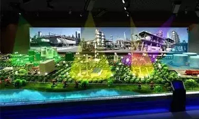 聲光電互動(dòng)沙盤是以制作精細(xì)的實(shí)體模型為基礎(chǔ),結(jié)合聲、光、電、影像,通過專業(yè)的同步控制軟件對(duì)聲、光、影像同步控制,實(shí)體模型內(nèi)置燈光。并借助投影顯示設(shè)備投影出一個(gè)尺寸超大的屏幕或使用尺寸超大的LED屏幕,播放演示區(qū)域的影片,展現(xiàn)出惟妙惟肖的效果和炫麗多彩的視覺沖擊。以生動(dòng)形象的姿態(tài)向參觀者演示地方各個(gè)區(qū)域及街道、生態(tài)環(huán)境、人居,吸引參觀者參與光電沙盤的互動(dòng),更加充分了解展示的地方。