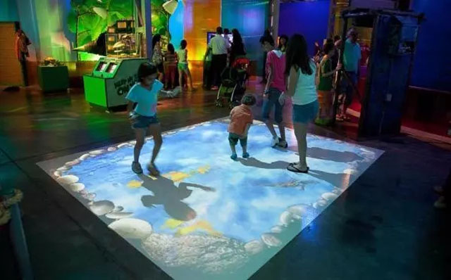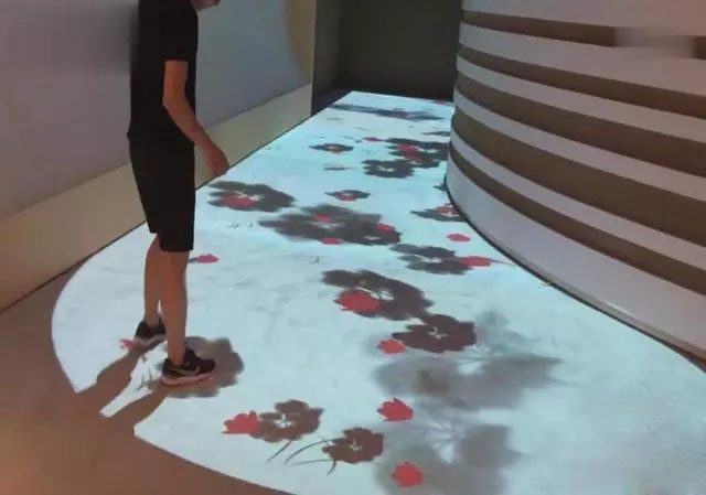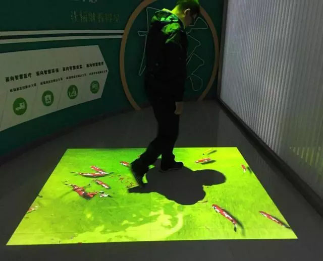 當(dāng)人走在地面上時(shí),水面會(huì)出現(xiàn)波紋,水中的魚碰到人的腳時(shí)會(huì)被“嚇跑”。可以吸引客源,讓人在路過的時(shí)候直接被這樣一種地面互動(dòng)系統(tǒng)所吸引。在商場和餐廳中目前使用這項(xiàng)地面互動(dòng)的比較多,能夠快速的吸引人群的注意力。
