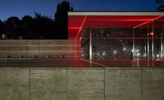 在巴塞羅那德國(guó)館內(nèi)設(shè)置的“燈光幾何”基于建筑的特點(diǎn),在建筑上把紅色激光投射成了大理石原本組合的網(wǎng)格狀方式。由于光可以透過(guò)玻璃,建筑的邊界因此有了進(jìn)一步擴(kuò)展,達(dá)成了另一種層面的“流動(dòng)空間”。