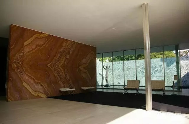 在第一次世界大戰(zhàn)之后,德國(guó)在 1924 年實(shí)施了道威斯計(jì)劃,經(jīng)濟(jì)得到復(fù)蘇。對(duì) 1929 年世博會(huì)德國(guó)館的設(shè)計(jì),建筑師為了讓它達(dá)到“向新的時(shí)代發(fā)出呼喚”的效果,讓場(chǎng)館擁有了“自由平面”和“流動(dòng)空間”的特點(diǎn)。它結(jié)構(gòu)簡(jiǎn)單,充分體現(xiàn)了建筑師在 1928 年提出的“少即是多”的原則、大理石構(gòu)成了規(guī)整的網(wǎng)格外觀;同時(shí),大理石的墻壁和地板從內(nèi)部延伸出來(lái),又使建筑的內(nèi)外界線變得模糊。