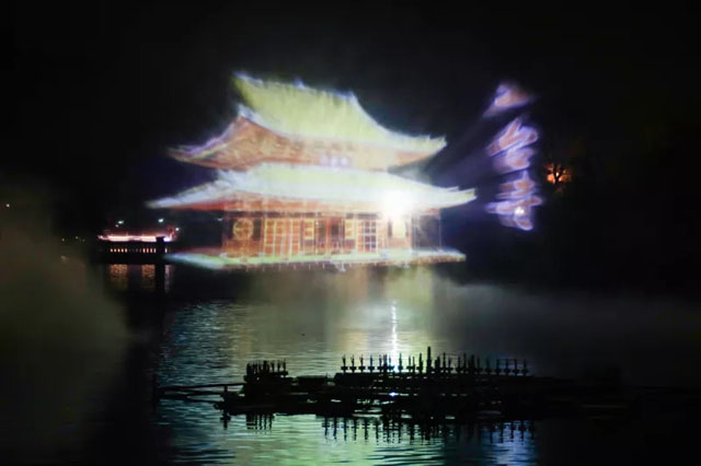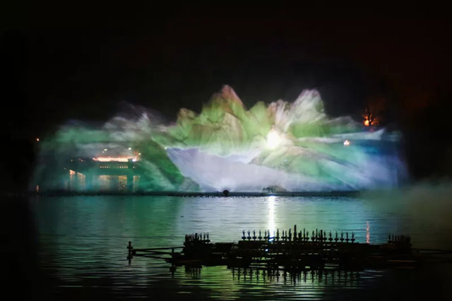 玉湖景區(qū)3D噴泉投影燈光秀新會(huì)首期亮化工程中“兩極一軸”的“城市創(chuàng)新極”的亮點(diǎn)。燈光秀以“古城新篇 攬景勝會(huì)”為主題,通過六個(gè)篇章,串起新會(huì)文化脈絡(luò)。