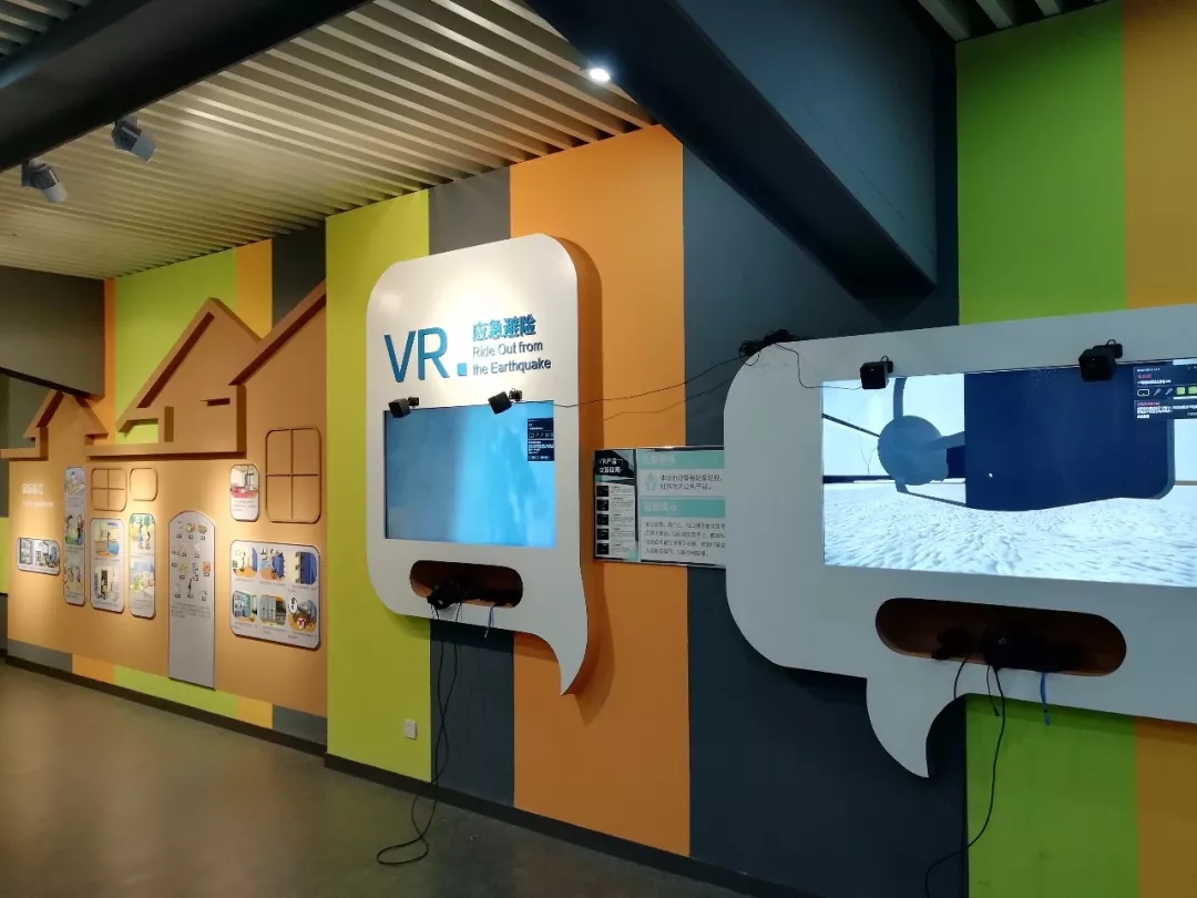 在科普廳,可以進(jìn)行VR體驗(yàn),進(jìn)行虛擬“應(yīng)急避險(xiǎn)”。參觀者戴上視覺(jué)頭盔,雙手拿住遙控器,可以選擇“系統(tǒng)體驗(yàn)教學(xué)”和“進(jìn)入地震體驗(yàn)”兩種模式,身臨其境地體驗(yàn)大地震來(lái)臨后,如何盡快地從房間中逃脫,如何進(jìn)行自救,增加自己的“實(shí)戰(zhàn)”經(jīng)驗(yàn)。同時(shí),墻上的電視屏幕也顯示著參觀者實(shí)時(shí)的視覺(jué)畫(huà)面,如果是孩子體驗(yàn),家長(zhǎng)還能在一旁進(jìn)行指導(dǎo)。