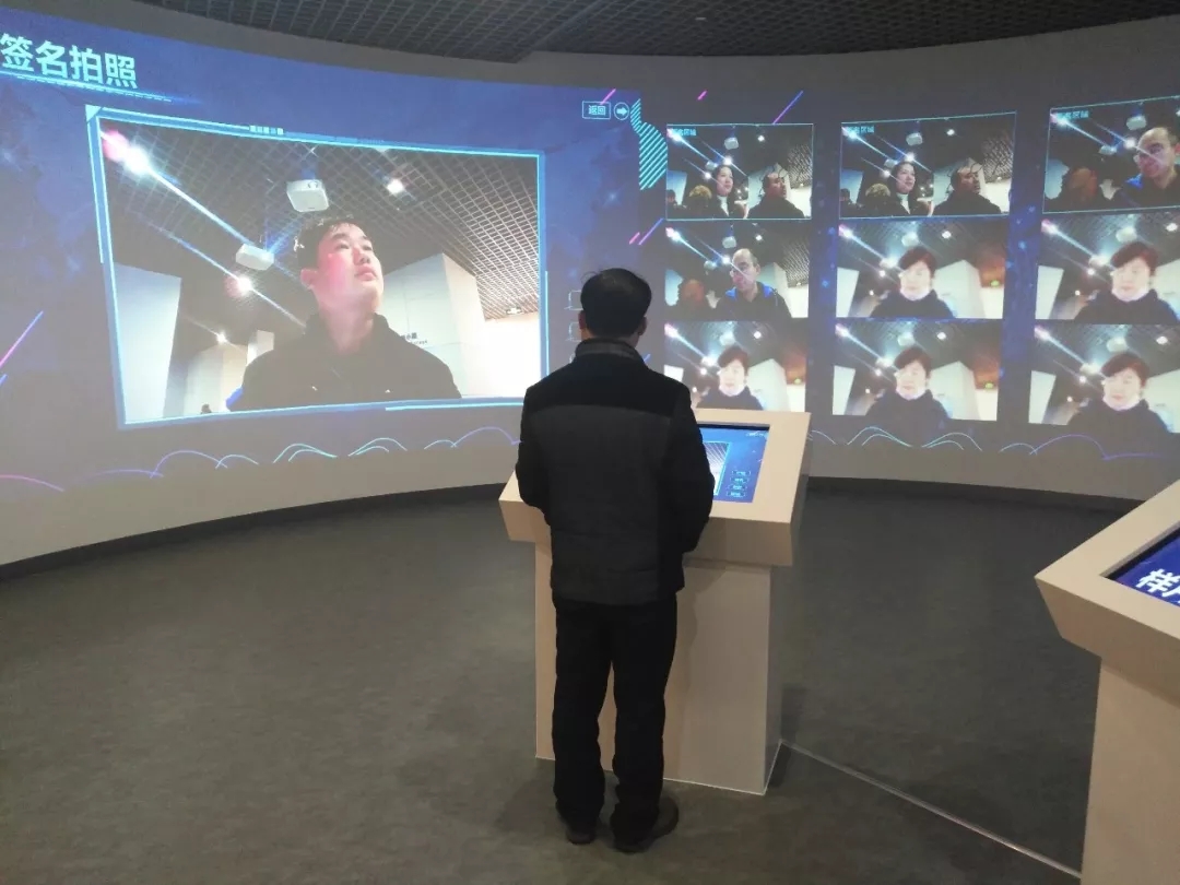 離開(kāi)科普廳,來(lái)到最后一個(gè)環(huán)節(jié)“互動(dòng)留念”。參觀者走到主控臺(tái)前,這時(shí)本人的畫(huà)面顯示在左前方圓弧形展板上,選擇拍攝后,留下自己的簽名,圖片將被保留下來(lái),出現(xiàn)在右前方展板上,這里還能看到其他參觀者留下的照片。在一旁的私人小房間中,參觀者還能錄制視頻。戴上耳機(jī),拿上話筒,講一段溫馨的話,或是說(shuō)出自己的心愿,或是留下自己參觀后的感受,這些也將會(huì)被保留,極大地增強(qiáng)了參觀者和展館之間的交流互動(dòng)。