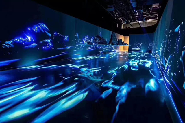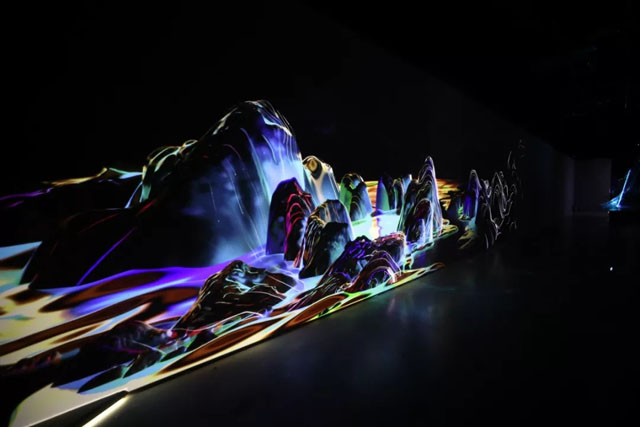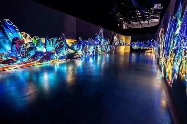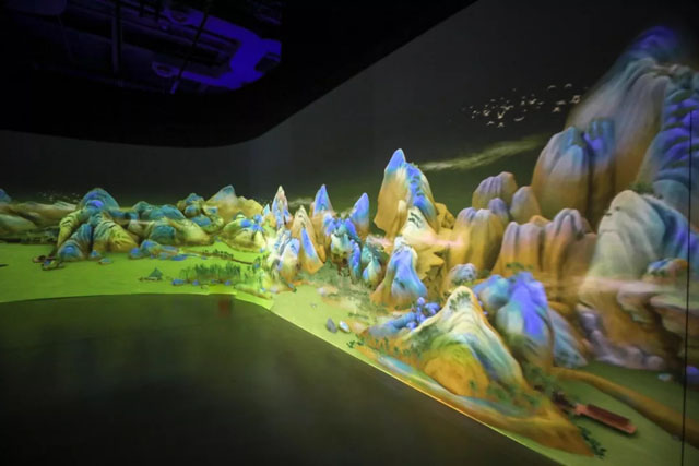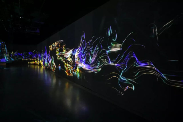 步入“千里江山圖”展廳,就宛若進入了一個擁有生命力的銀河,閃亮的群星由遠及近以動態(tài)的方式劃過宇宙,極致的縱深感讓參觀者仿佛觸碰不到展廳的“面”和“線”,只有“空間”和“時間”的高維感受。