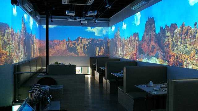走進(jìn)新加坡花千代秘制烤魚店,與迎賓地毯不同是地面極具動感的投影,踏進(jìn)店面之時呈現(xiàn)了碧波蕩漾的池塘,有魚翔淺底的波動感。當(dāng)然,花千代的投影畫面不止這一種主題,近十個風(fēng)格迥異的主題畫面將為大家逐一播放,時而靜謐、時而躍動,四周環(huán)繞的全息投影帶你進(jìn)入不一樣的世界:有流光溢彩的都市麗景,有氣勢磅礴的山巔云海,有漫山遍野的怒放鮮花,有寧靜神秘的皚皚雪山。僅僅一頓飯的時間,食客們便能穿梭于神秘的熱帶雨林魚群,在碧海藍(lán)天中乘風(fēng)破浪直掛長帆,穿過落葉繽紛的楓樹林,在綠意盎然的竹林漫步遠(yuǎn)眺。在這樣變換萬分的場景中進(jìn)餐,能感受到滿滿的情調(diào)。不論是聚會還是約會,都是一處值得嘗試的優(yōu)質(zhì)餐廳。
