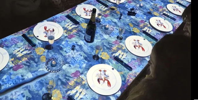 桌面互動投影主要應用與主題餐廳互動投影,桌面互動投影讓普通的桌面變得鮮活起來,成為一個娛樂中心和信息資訊平臺。食客可在主題餐廳的桌面互動投影上觀看美食制作,以及點餐,并且在進餐過程中,通過桌面互動投影與地面互動投影,墻面互動投影三者相結合,打造沉浸式空間,讓食客仿佛置身于各種場景中就餐,趣味連連!