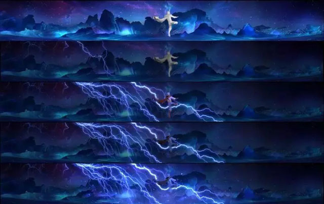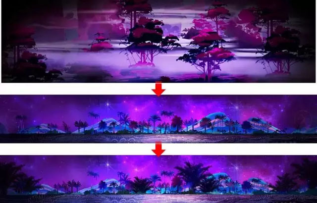在諾仕達(dá)集團(tuán)的高度支持下,金剛科技集團(tuán)集合行業(yè)精英,帶著滿腔誠意,歷時(shí)近三載,最終完成實(shí)景演藝秀《孔雀公主》。為了能向觀眾傳遞出云南民族文化的魅力和精髓,水秀的創(chuàng)作首先進(jìn)行了大量的研究和采風(fēng),在諾仕達(dá)集團(tuán)文產(chǎn)藝術(shù)中心組織下,從人物服飾、造型、建筑、場(chǎng)景布局、舞蹈、武術(shù)和動(dòng)植物元素等方面,以82年電影版畫面為基礎(chǔ),結(jié)合對(duì)各類文物的研究,保證了每個(gè)細(xì)節(jié)的準(zhǔn)確和精細(xì)。這部演藝秀秉承“再造經(jīng)典”的戰(zhàn)略格局,讓情懷落地,在作品中傳達(dá)珍貴的“匠心”精神。在文化和旅游融合的大勢(shì)之下,打破快餐式的簡(jiǎn)單復(fù)制創(chuàng)作模式,重磅重塑令人感動(dòng)的時(shí)代經(jīng)典,為民族文化的傳承帶來了新啟發(fā)。/ 大型水秀《孔雀公主》由諾仕達(dá)集團(tuán)文產(chǎn)藝術(shù)中心總監(jiān),歡樂世界主題演藝統(tǒng)籌李驊任藝術(shù)指導(dǎo),由金剛集團(tuán)總導(dǎo)演苗茂、設(shè)備導(dǎo)演陳健帶領(lǐng)全體設(shè)備、設(shè)計(jì)、影視特效、三維、動(dòng)畫、渲染、動(dòng)捕、音樂、配音、編舞及工程等專業(yè)團(tuán)隊(duì)成員共計(jì)120余人,從水秀演出形式的特點(diǎn)出發(fā),進(jìn)行了大量的嘗試和創(chuàng)新。在夜間實(shí)景演藝秀影片制作過程中,使用了《猩球崛起》等諸多奧斯卡視效提名獎(jiǎng)的電影原版運(yùn)動(dòng)捕捉設(shè)備;在3D角色動(dòng)作設(shè)計(jì)中,將舞蹈演員獨(dú)具云南韻味的表演成功還原在了影片三維角色身上;在演出系統(tǒng)設(shè)計(jì)中,運(yùn)用了水、火、燈光、激光、霧森、視頻等特效演出系統(tǒng),以“水舞臺(tái)”與“空中舞臺(tái)”結(jié)合為創(chuàng)意點(diǎn),逐層顯現(xiàn)五彩斑斕的大千世界,營造出萬事萬物、周而復(fù)始、美輪美奐的人間萬象,使游客置身于唯美奇幻的世界中。