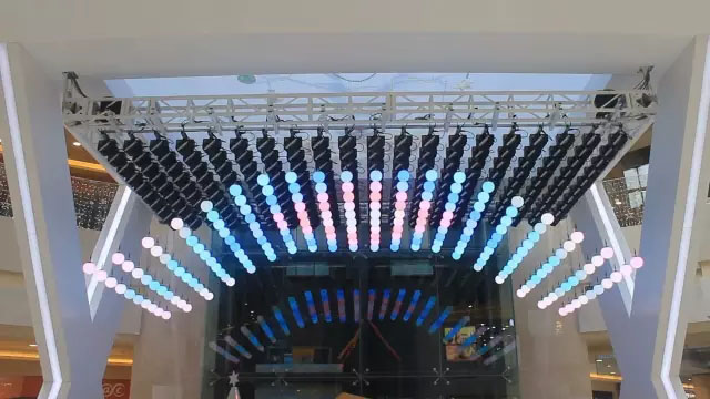 夢(mèng)幻浮球矩陣集成了運(yùn)動(dòng)控制、電機(jī)技術(shù)、機(jī)械、計(jì)算機(jī)算法、圖形像素、視覺藝術(shù)和音樂(lè)表現(xiàn)等多種學(xué)科的技術(shù),每個(gè)小球在計(jì)算機(jī)的控制下井然有序地運(yùn)動(dòng),演繹著曲線、曲面、平面、文字和三維圖案等各種動(dòng)態(tài)造型,整體效果如同一副流光溢彩的立體畫,是科技與藝術(shù)的完美結(jié)合,是當(dāng)今新媒體現(xiàn)代藝術(shù)演示的最新成果。浮球矩陣可應(yīng)用于酒店、機(jī)場(chǎng)、火車站、商務(wù)大廳、商城、科技館、展覽館、博物館、展會(huì)、大型活動(dòng)現(xiàn)場(chǎng)、演出等場(chǎng)合。