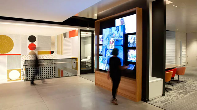 在漢堡大學(xué)互動(dòng)中心附近,有一百多個(gè)木框數(shù)字顯示屏的墻壁更新,以顯示當(dāng)前出席的每個(gè)大學(xué)生的照片,有趣的個(gè)人事實(shí)和畢業(yè)接管模式,以慶祝課程完成。在后臺(tái),這兩種體驗(yàn)都可以通過(guò)自定義內(nèi)容管理系統(tǒng)輕松更新。