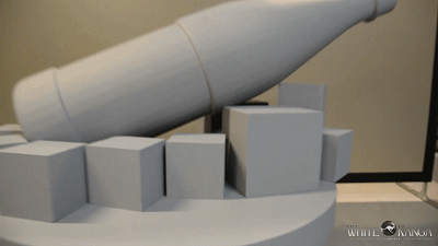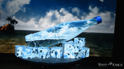 該投影秀的裝置設(shè)計原理并不復(fù)雜。一組純白色的模型,包括真實比例的礦泉水瓶形狀,底座四周布滿大大小小的“冰塊”。模型被安置在一個扁形圓柱底座上,底座可隨著投影背景緩緩轉(zhuǎn)動。