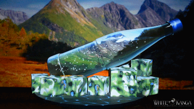 這是WHITE KANGA利用大型礦泉水模型做為幕布結(jié)合各種投影儀,為大家呈現(xiàn)的一場場平面與立面的同步投影秀。這瓶礦泉水不僅能將一幅幅美妙的大自然風(fēng)光裝進(jìn)瓶內(nèi),營造出自然純凈的氛圍,還能夠通過不同的光影設(shè)計表現(xiàn)出時尚的感覺。