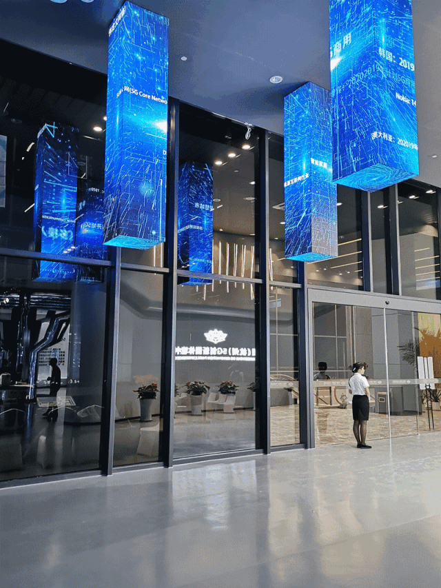 5G體驗中心里,異形屏賺足了眼球。體驗中心門口,是從天花板倒垂的4個柱形異形屏,科技感鋪面而來。打破傳統(tǒng)LED顯示屏規(guī)則形狀的限制,驚人的魅力帶給觀眾以美的享受。