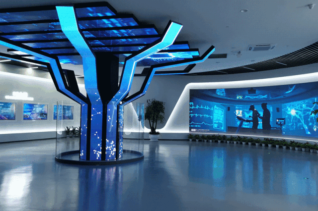 走進體驗中心,位于正中央的是“頂天立地”的樹形屏,創(chuàng)意造型搭配美輪美奐的顯示效果,流光溢彩、科技感十足!