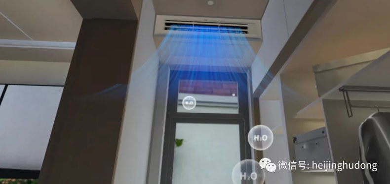 體驗(yàn)者看到畫面中被具象化的二氧化碳,通過語音提示、綠色光帶看到空調(diào)新風(fēng)的散入,將其 "新風(fēng)自潔凈"的功能、以及其“熱交換與處理”技術(shù)轉(zhuǎn)換為肉眼可見的畫面,這時(shí)再通過語音提示將優(yōu)勢(shì)進(jìn)行總括,體驗(yàn)者便可輕松理解,在潛移默化中達(dá)成認(rèn)同。