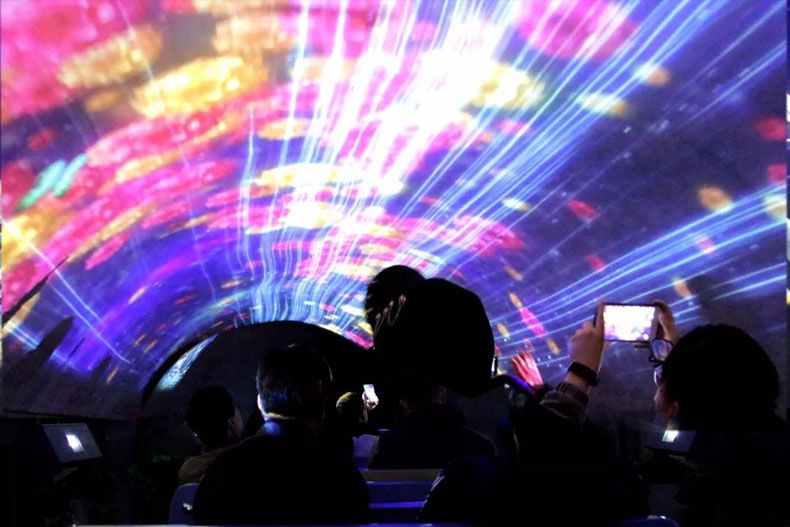 時(shí)空隧道全長1000米,是目前我國最長的時(shí)光隧道。整個(gè)隧道設(shè)計(jì)4個(gè)投影節(jié)點(diǎn),節(jié)點(diǎn)與節(jié)點(diǎn)之間設(shè)計(jì)6處霧幕,將4個(gè)投影節(jié)點(diǎn)相串聯(lián),形成一個(gè)完整的投影劇目。乘坐時(shí)空小火車進(jìn)入隧道,展現(xiàn)在眼前的是現(xiàn)代科技帶來的獨(dú)特視覺魅力,可以身臨其境地感受人類誕生、繁衍、進(jìn)化全過程,既有造山運(yùn)動(dòng)和秦嶺的形成,也有遠(yuǎn)古海洋生物以及刀兵相見的戰(zhàn)爭場面,把上下億萬年的時(shí)空變化濃縮在隧道之內(nèi)。