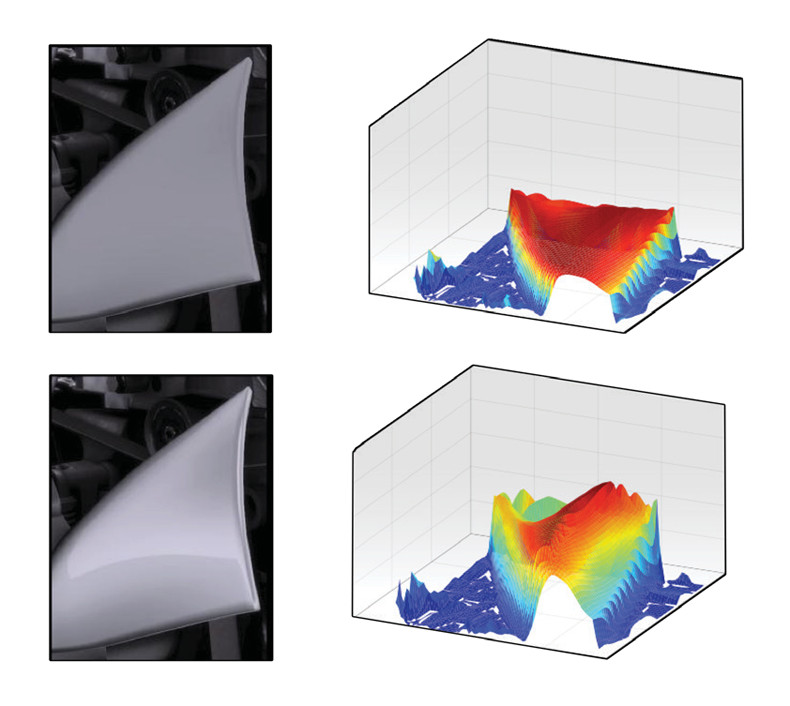針對風扇葉片上測得的亮度進行 3D 繪圖(圖 4),可看到無鏡面高光的“平淡”圖像的輪廓幾近扁平。采用 HDR 技術后,風扇葉片的細微色調(diào)得以體現(xiàn)。HDR 將自然光照下的輪廓進行再現(xiàn),圖像效果更為逼真。