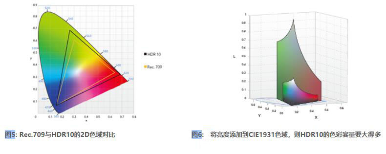 在圖 5 中 ,CIE 1931 的 2D xy 色彩空間中 HDR 10 的三角形看起來并不大。然而,如果添加亮度作為第三維數(shù)據(jù)并旋轉圖形,則可以看到顯示的總色彩容量遠超 Rec.709(圖 6)。
