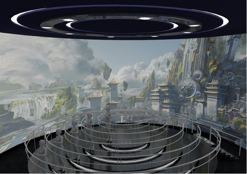 360度動(dòng)感環(huán)幕立體影院項(xiàng)目占地約800平方米,采用獨(dú)創(chuàng)的360°動(dòng)感弧幕劇場(chǎng)形,游客站立在動(dòng)感平臺(tái)之上,佩戴3D眼鏡,手扶護(hù)欄可360°觀賞宏大的影片畫(huà)面。