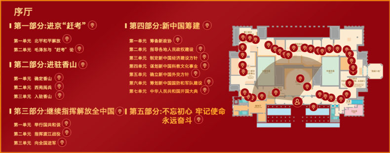 展覽分為5個部分15個單元,包括“進(jìn)京趕考”、“進(jìn)駐香山”、“繼續(xù)指揮解放全中國”、“新中國籌建”和“不忘初心 牢記使命 永遠(yuǎn)奮斗”五個部分。