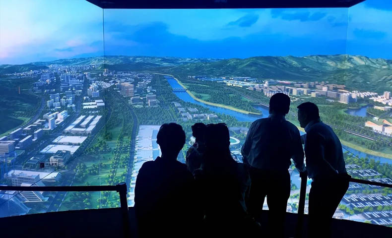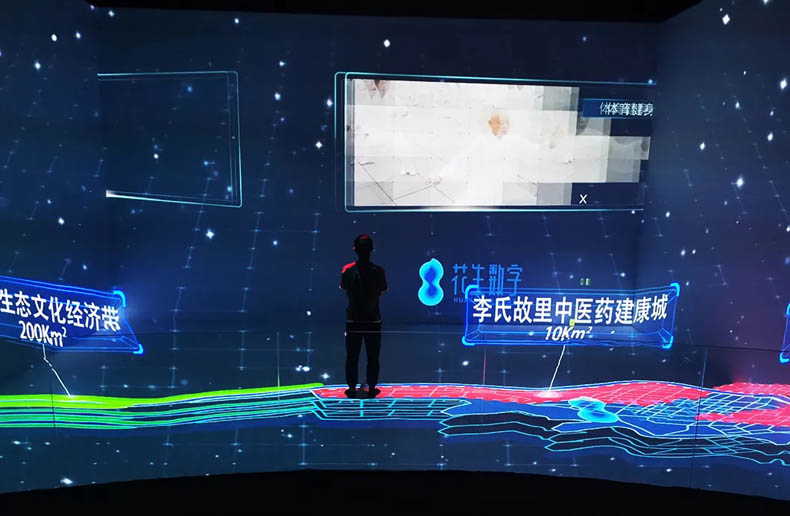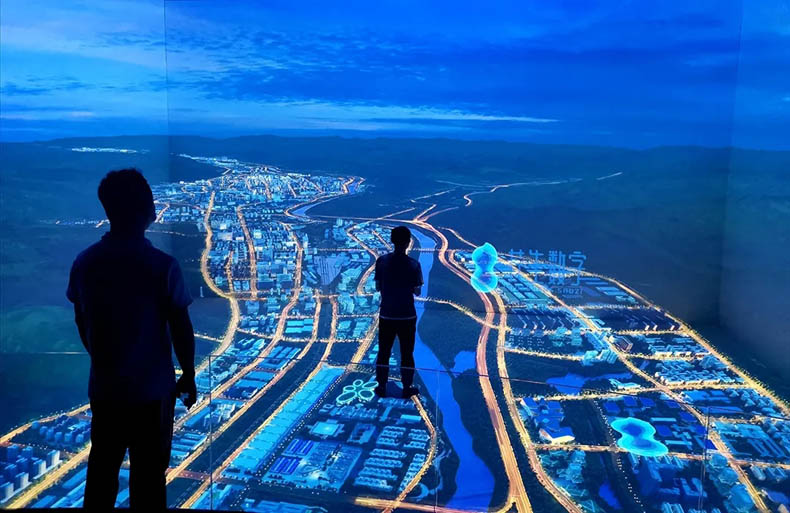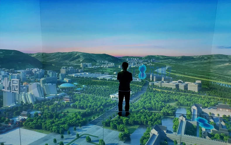 由四幅投影屏幕組成,配合數(shù)字化沙盤及內(nèi)容共同展示。比實體沙盤更具沉浸感和3D視覺效果,更能充分展示未來的規(guī)劃場景。配合聲、光、電等展示技術(shù),更具視覺沖擊效果,富有科技感,讓參觀者留下深刻的印象。