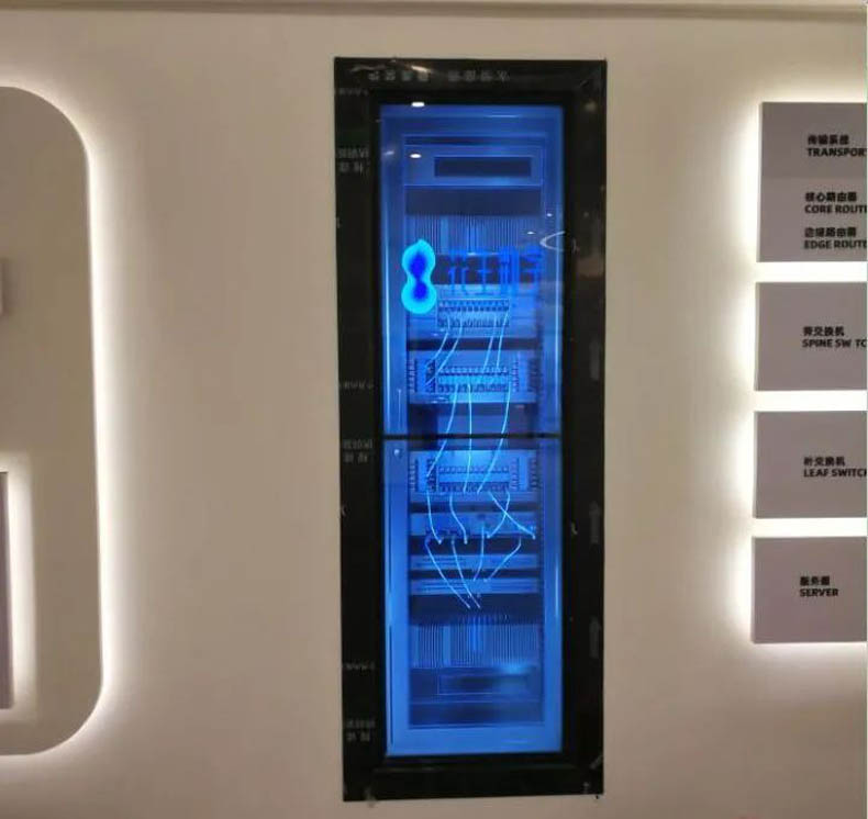 無人互動(dòng)時(shí),屏幕呈現(xiàn)待機(jī)狀態(tài)——顯示完整機(jī)柜。各層級(jí)設(shè)備之間由光纖相連。