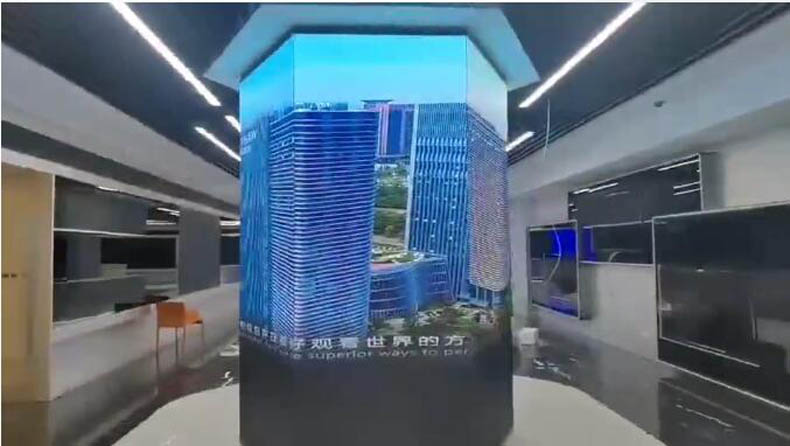 該項(xiàng)目為山東某展廳項(xiàng)目,項(xiàng)目中融合了八字異形屏、圓柱形屏以及方柱形屏,均為P1.86LED異形屏,其中八字形屏面積達(dá)130㎡,各形態(tài)異形屏相結(jié)合,突破室內(nèi)展廳陳規(guī),提高了展示價(jià)值;精彩紛呈的展示畫面結(jié)合異形屏帶來的視覺滿足感讓人不禁感嘆:?低暜愋纹,果然夠型!