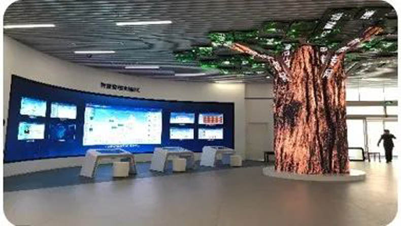 該屏是為某智慧中心顯示系統(tǒng)打造的異形屏,其整體的拼接分為兩部分:樹葉(5.44平方米)+樹干(25.74平方米),遠(yuǎn)看赫然是一顆直沖房頂?shù)拇髽?近看才知其中構(gòu)造。