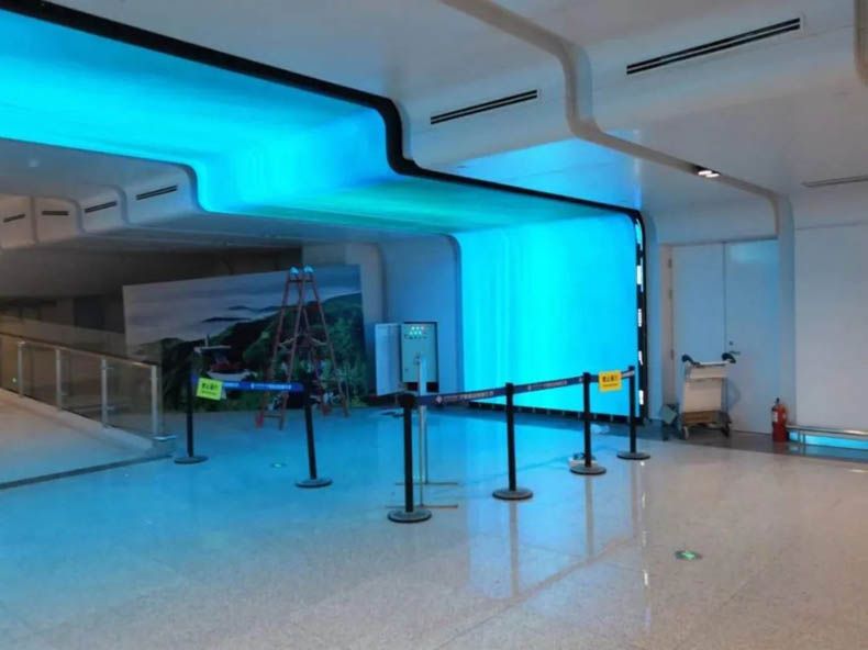 該屏為寧夏某機(jī)場(chǎng)P2.0 74㎡LED異形屏項(xiàng)目案例,整體呈階梯形狀,完美與機(jī)場(chǎng)墻面融合,配合顯示畫面使乘客在待機(jī)時(shí)就感受到徜徉天空之感。