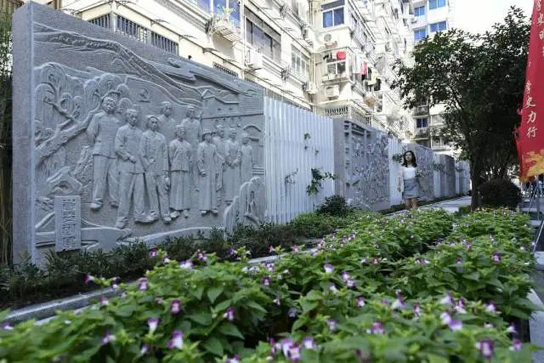 戶外紅色街區(qū)中,以“省委創(chuàng)建”“武裝斗爭”“當家作主”“改革先行”“共同富裕”為主題的大型浮雕,高度精煉地展現(xiàn)了在中共中央的堅強領導下,省委團結帶領全省人民實現(xiàn)了從站起來、富起來到強起來的偉大飛躍。